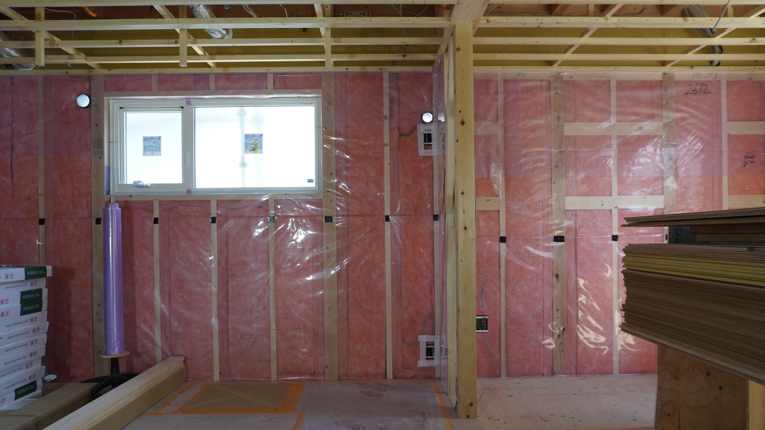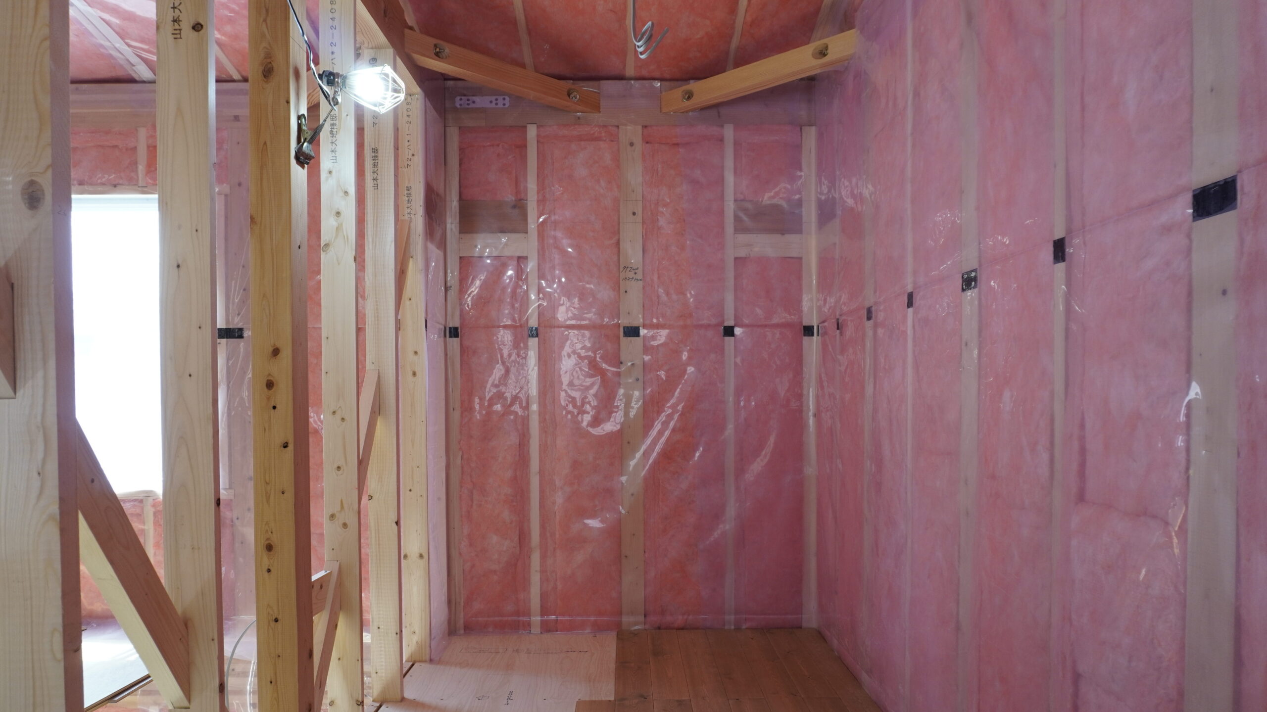 外周壁の室内側下地ボードと断熱材の間に、透湿抵抗値の高い防湿フィルムを隙間なく施工