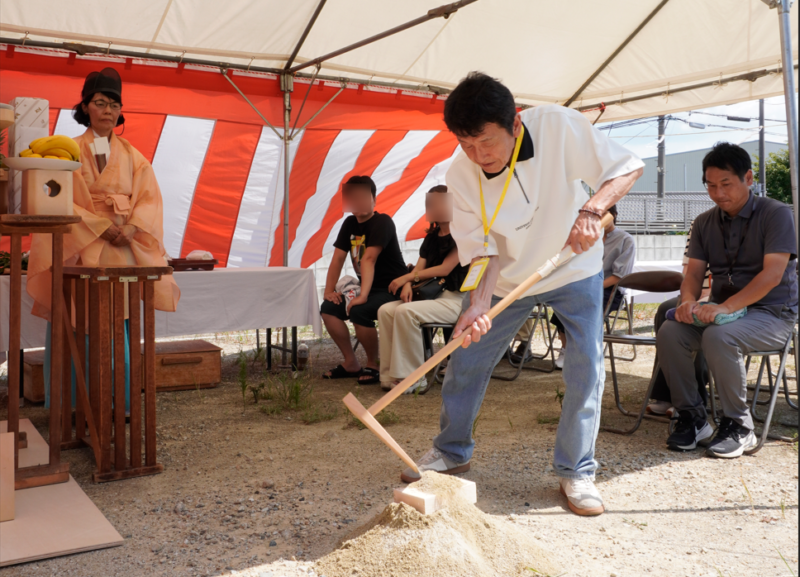 工事の始まりを象徴する場面で、地鎮祭の中でも印象的な工程です。