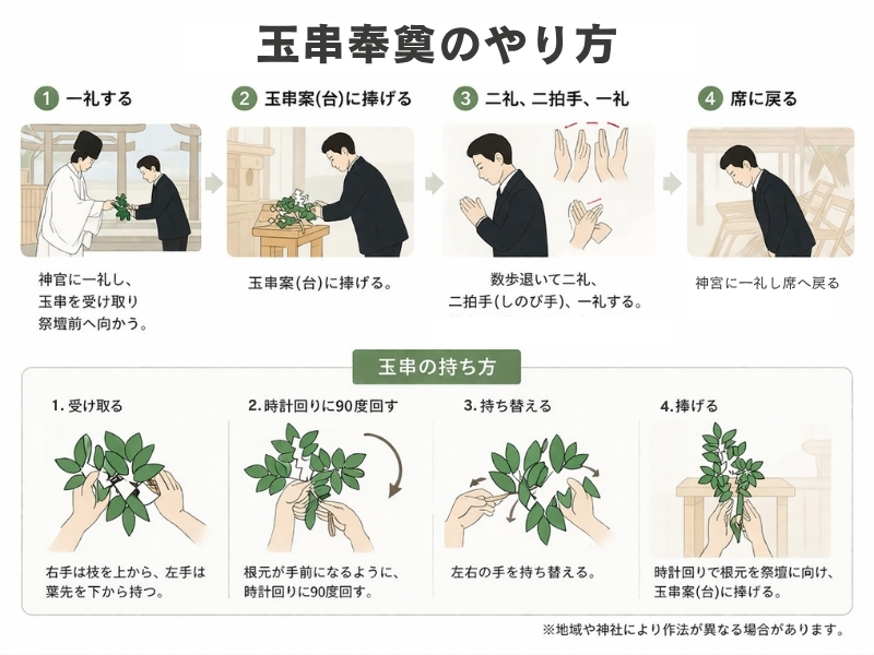 榊(さかき)の枝に紙をつけた玉串を神前にお供えし、