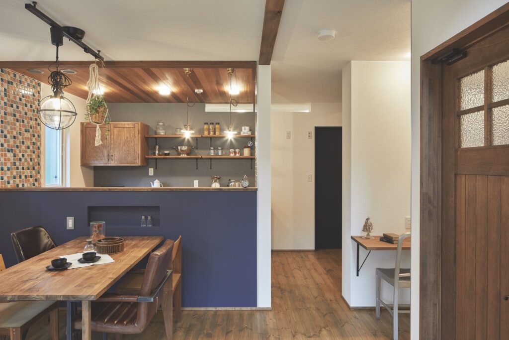 大阪府泉南郡熊取町で建てた、カフェ風デザインと自然素材にこだわった住まいの施工事例。おしゃれなカフェのような可愛らしさと、無垢材の温もりを融合させた心地よい空間をご紹介します。